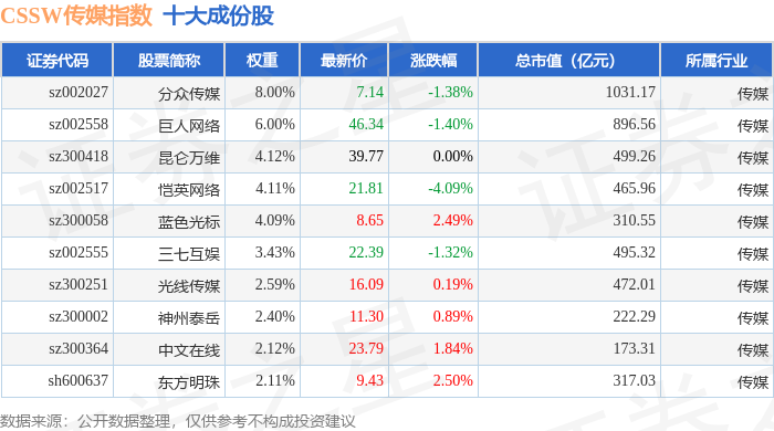 CSSW传媒(399810)指数十大成份股详情如下: