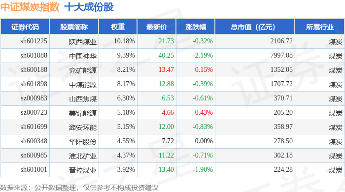 中证煤炭(399998)指数十大成份股详情如下: