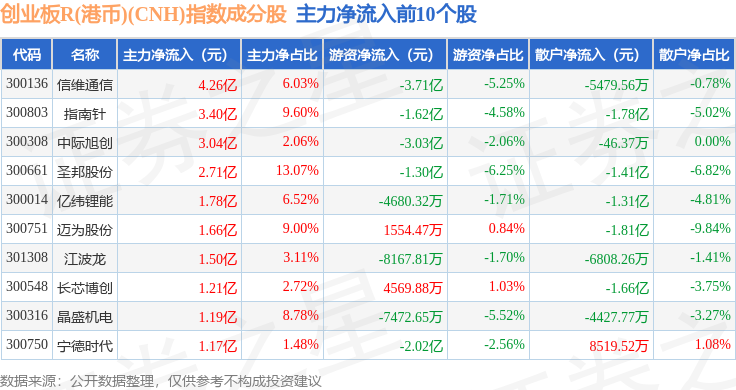 资金流向方面,创业板R(港币)(CNH)(470006)指数成份股当日主力资金净流出合计8.02亿元,游资资金净流出合计9.39亿元,散户资金净流入合计17.41亿元。成份股资金流向详情见下表: