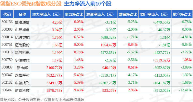 资金流向方面,创指ESG领先R(470031)指数成份股当日主力资金净流出合计2171.85万元,游资资金净流出合计11.3亿元,散户资金净流入合计11.52亿元。成份股资金流向详情见下表: