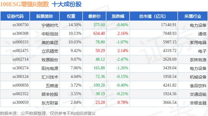 资金流向方面,100ESG增强R(470033)指数成份股当日主力资金净流出合计7.19亿元,游资资金净流出合计2.89亿元,散户资金净流入合计10.08亿元。成份股资金流向详情见下表:
