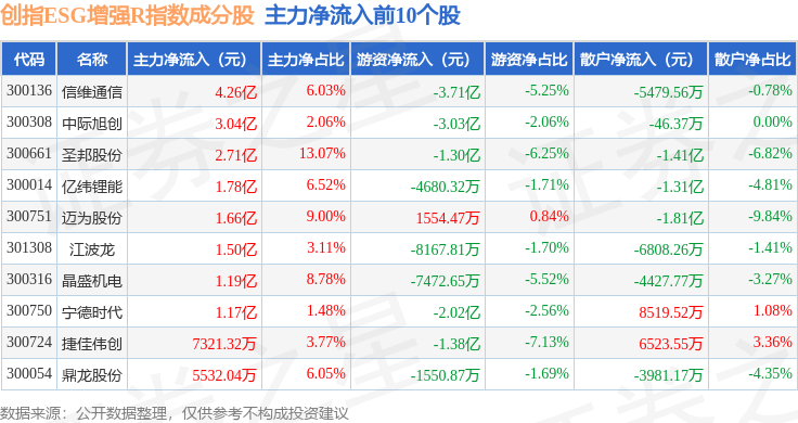 资金流向方面,创指ESG增强R(470034)指数成份股当日主力资金净流出合计6.42亿元,游资资金净流出合计3.46亿元,散户资金净流入合计9.88亿元。成份股资金流向详情见下表: