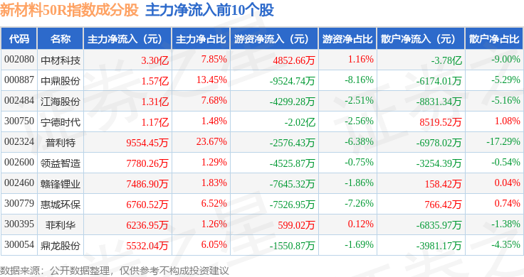 资金流向方面,新材料50R(470042)指数成份股当日主力资金净流入合计5.28亿元,游资资金净流出合计11.23亿元,散户资金净流入合计5.95亿元。成份股资金流向详情见下表: