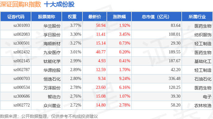 证券之星消息,12月24日,深证回购R(470063)指数报收于3259.27点,涨1.66%,成交361.89亿元,换手率1.65%。当日该指数成份股中,上涨的有36家,华联控股以9.95%的涨幅领涨,下跌的有13家,千味央厨以3.1%的跌幅领跌。