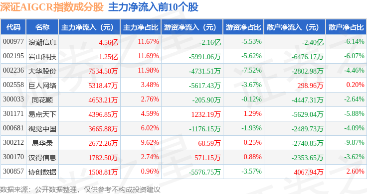 资金流向方面,深证AIGCR(470075)指数成份股当日主力资金净流出合计9731.38万元,游资资金净流出合计2.75亿元,散户资金净流入合计3.73亿元。成份股资金流向详情见下表:
