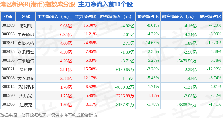 资金流向方面,湾区新兴R(港币)(480008)指数成份股当日主力资金净流入合计19.13亿元,游资资金净流出合计17.31亿元,散户资金净流出合计1.81亿元。成份股资金流向详情见下表: