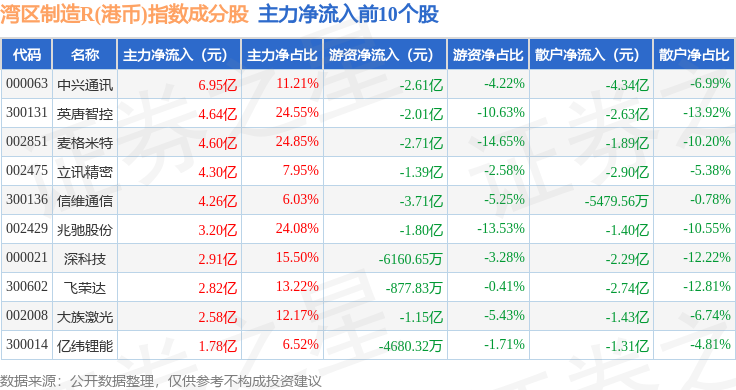 资金流向方面,湾区制造R(港币)(480010)指数成份股当日主力资金净流入合计19.02亿元,游资资金净流出合计12.79亿元,散户资金净流出合计6.23亿元。成份股资金流向详情见下表: