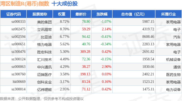 湾区制造R(港币)(480010)指数十大成份股详情如下: