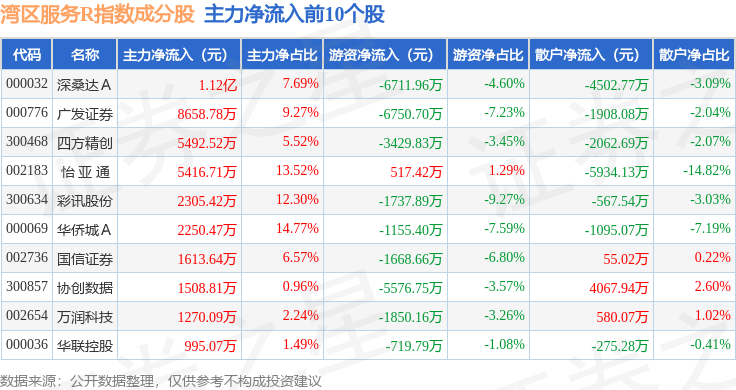 资金流向方面,湾区服务R(480011)指数成份股当日主力资金净流出合计1.5亿元,游资资金净流出合计4.21亿元,散户资金净流入合计5.7亿元。成份股资金流向详情见下表: