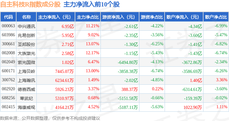 资金流向方面,自主科技R(480033)指数成份股当日主力资金净流入合计3.87亿元,游资资金净流出合计3.46亿元,散户资金净流出合计4101.69万元。成份股资金流向详情见下表: