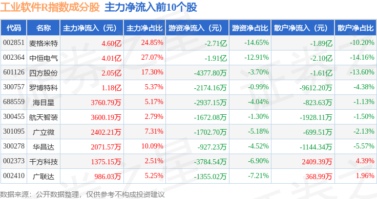 资金流向方面,工业软件R(480034)指数成份股当日主力资金净流入合计7.6亿元,游资资金净流出合计8.09亿元,散户资金净流入合计4917.23万元。成份股资金流向详情见下表: