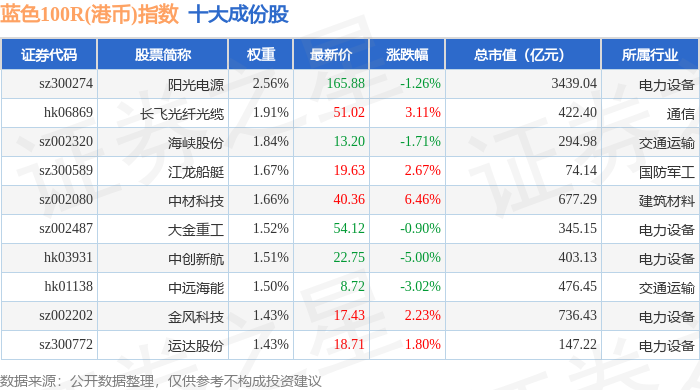 蓝色100R(港币)(480069)指数十大成份股详情如下: