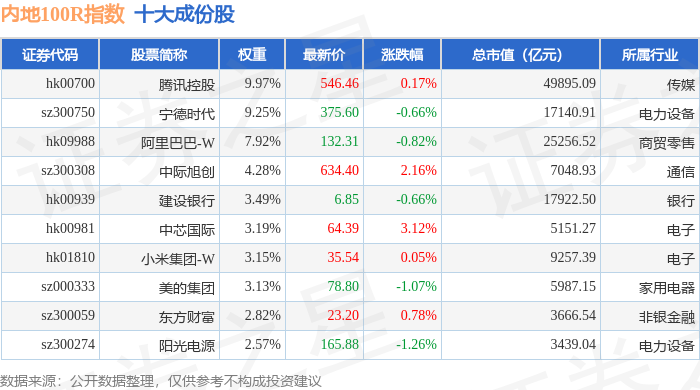 证券之星消息,12月24日,内地100R(483001)指数报收于2820.65点,跌0.02%,成交1351.27亿元,换手率0.4%。当日该指数成份股中,上涨的有46家,鹏鼎控股以4.67%的涨幅领涨,下跌的有47家,FIT HON TENG以3.51%的跌幅领跌。