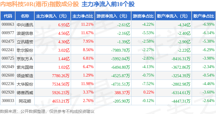 资金流向方面,内地科技50R(港币)(483004)指数成份股当日主力资金净流入合计17.05亿元,游资资金净流出合计11.66亿元,散户资金净流出合计5.38亿元。成份股资金流向详情见下表: