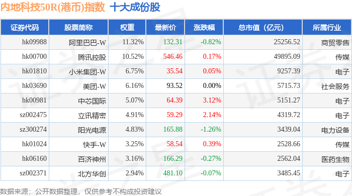 内地科技50R(港币)(483004)指数十大成份股详情如下: