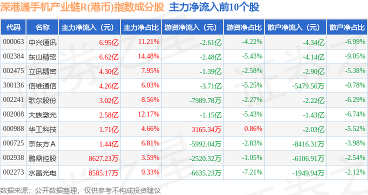 深港通手机产业链R(港币)(483010)指数十大成份股详情如下: