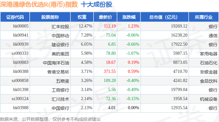 深港通绿色优选R(港币)(483012)指数十大成份股详情如下: