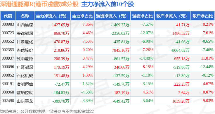 资金流向方面,深港通能源R(港币)(483014)指数成份股当日主力资金净流入合计34.37万元,游资资金净流入合计674.68万元,散户资金净流出合计709.05万元。成份股资金流向详情见下表: