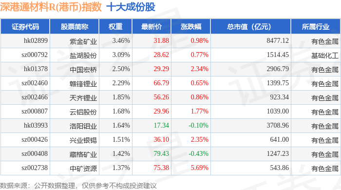 深港通材料R(港币)(483016)指数十大成份股详情如下: