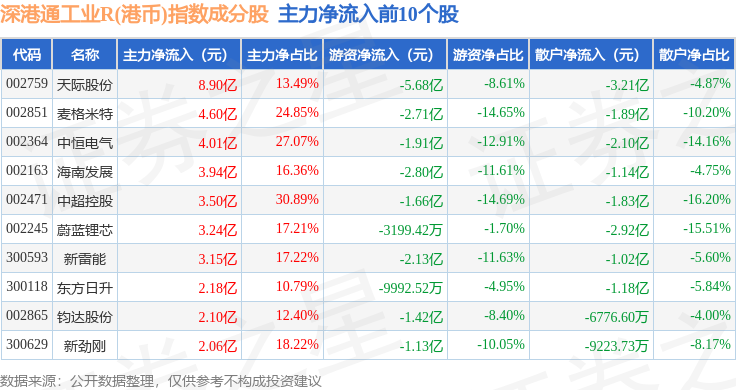 资金流向方面,深港通工业R(港币)(483018)指数成份股当日主力资金净流入合计37.33亿元,游资资金净流出合计43.65亿元,散户资金净流入合计6.32亿元。成份股资金流向详情见下表: