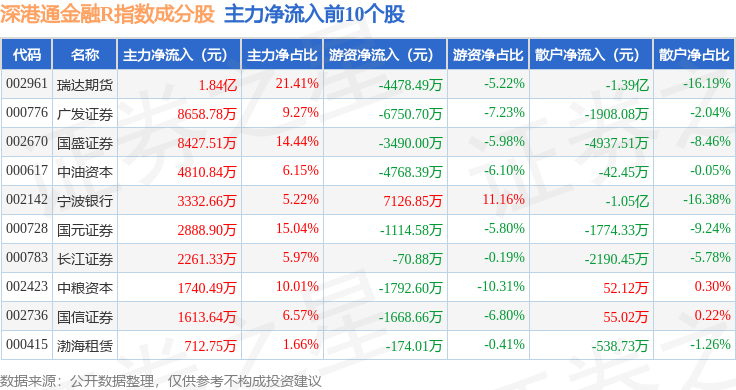 资金流向方面,深港通金融R(483025)指数成份股当日主力资金净流入合计1.11亿元,游资资金净流出合计1.21亿元,散户资金净流入合计1030.05万元。成份股资金流向详情见下表: