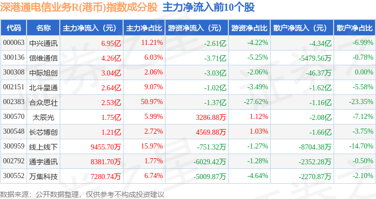 资金流向方面,深港通电信业务R(港币)(483030)指数成份股当日主力资金净流入合计8.13亿元,游资资金净流出合计1.11亿元,散户资金净流出合计7.02亿元。成份股资金流向详情见下表: