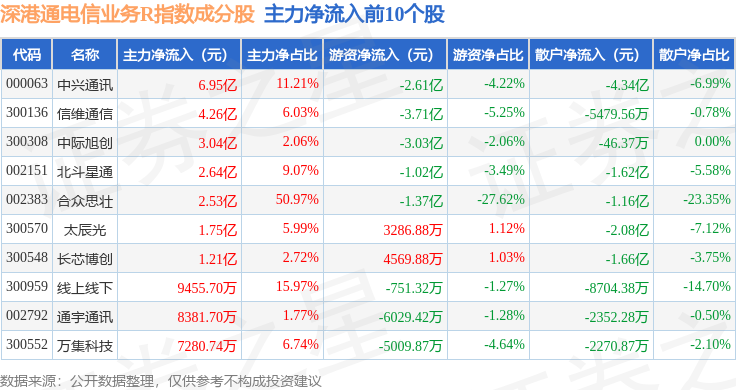 资金流向方面,深港通电信业务R(483029)指数成份股当日主力资金净流入合计8.13亿元,游资资金净流出合计1.11亿元,散户资金净流出合计7.02亿元。成份股资金流向详情见下表: