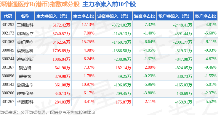 资金流向方面,深港通医疗R(港币)(483036)指数成份股当日主力资金净流出合计1.54亿元,游资资金净流出合计7732.22万元,散户资金净流入合计2.32亿元。成份股资金流向详情见下表: