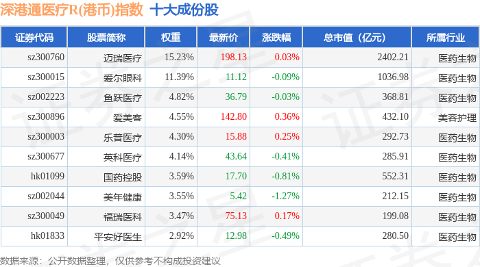 深港通医疗R(港币)(483036)指数十大成份股详情如下: