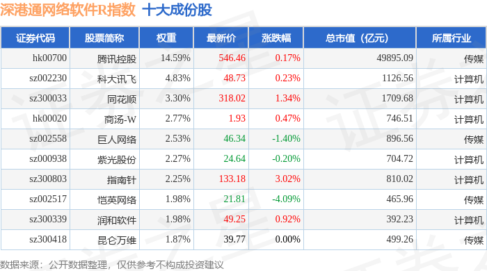 深港通网络软件R(483047)指数十大成份股详情如下: