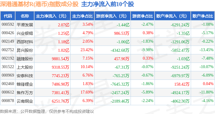 资金流向方面,深港通基材R(港币)(483062)指数成份股当日主力资金净流入合计1.78亿元,游资资金净流出合计9.56亿元,散户资金净流入合计7.78亿元。成份股资金流向详情见下表: