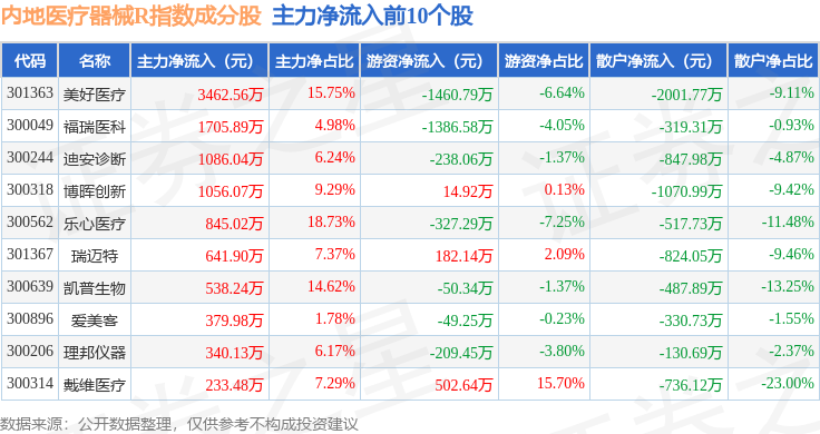 资金流向方面,内地医疗器械R(483103)指数成份股当日主力资金净流出合计9226.66万元,游资资金净流出合计6579.85万元,散户资金净流入合计1.58亿元。成份股资金流向详情见下表: