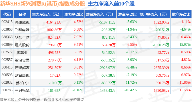 资金流向方面,新华SHS新兴消费R(港币)(489007)指数成份股当日主力资金净流出合计14.9亿元,游资资金净流入合计4.22亿元,散户资金净流入合计10.68亿元。成份股资金流向详情见下表: