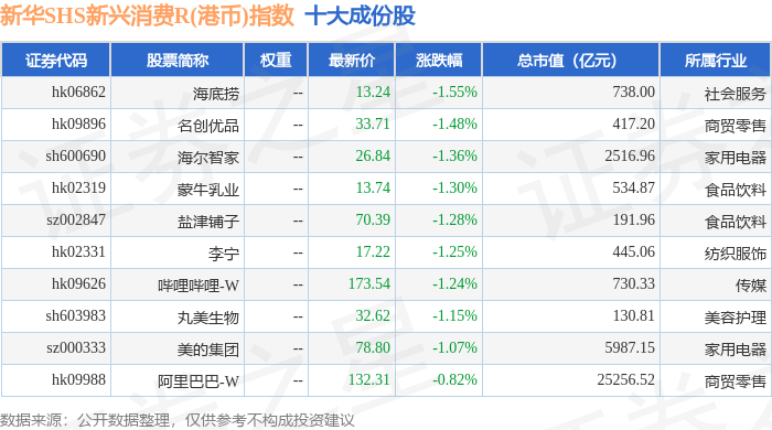 新华SHS新兴消费R(港币)(489007)指数十大成份股详情如下: