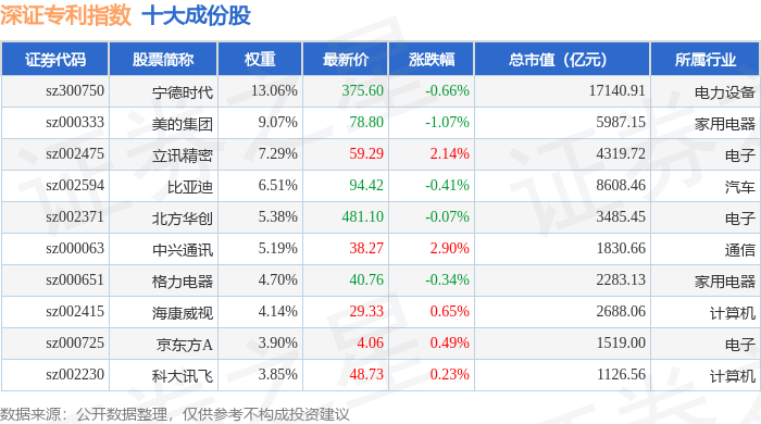 深证专利(970067)指数十大成份股详情如下: