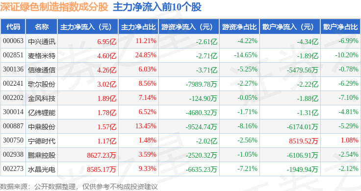 资金流向方面,深证绿色制造(970069)指数成份股当日主力资金净流入合计13.63亿元,游资资金净流出合计14.3亿元,散户资金净流入合计6644.44万元。成份股资金流向详情见下表: