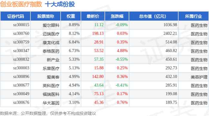 创业板医疗(970082)指数十大成份股详情如下: