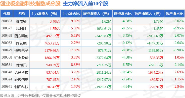 资金流向方面,创业板金融科技(970085)指数成份股当日主力资金净流入合计3.06亿元,游资资金净流出合计4.85亿元,散户资金净流入合计1.79亿元。成份股资金流向详情见下表: