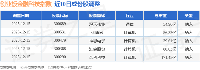 近10日内创业板金融科技(970085)指数成份股做了调整,新纳入了5只股票。