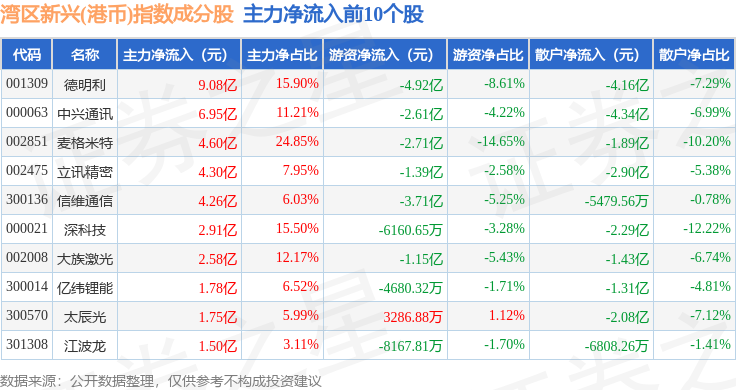 资金流向方面,湾区新兴(港币)(980008)指数成份股当日主力资金净流入合计19.13亿元,游资资金净流出合计17.31亿元,散户资金净流出合计1.81亿元。成份股资金流向详情见下表: