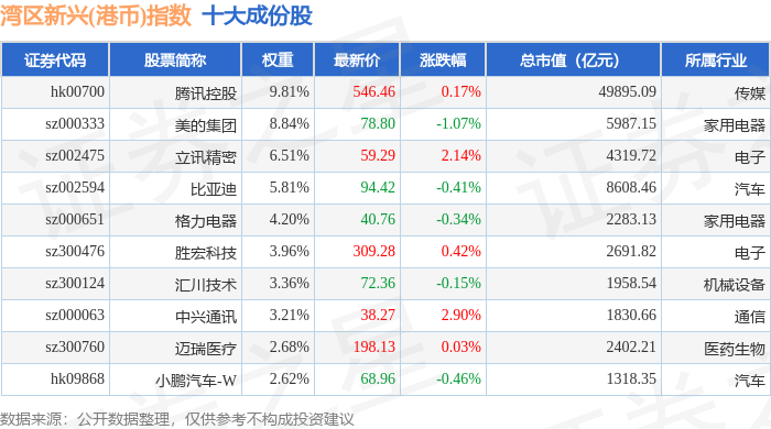 湾区新兴(港币)(980008)指数十大成份股详情如下: