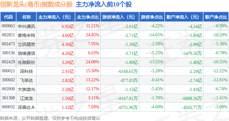 资金流向方面,创新龙头(港币)(980037)指数成份股当日主力资金净流入合计20.7亿元,游资资金净流出合计15.44亿元,散户资金净流出合计5.26亿元。成份股资金流向详情见下表:
