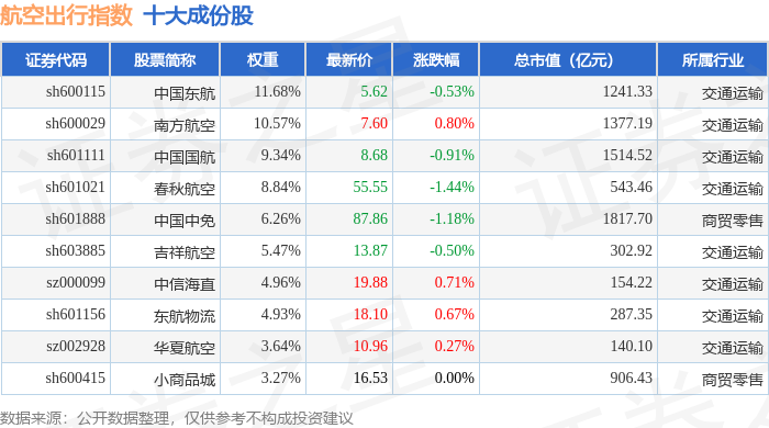 航空出行(980059)指数十大成份股详情如下:
