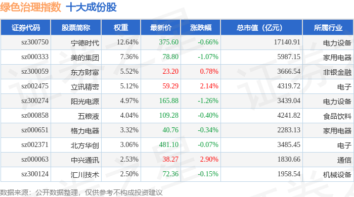 绿色治理(980058)指数十大成份股详情如下: