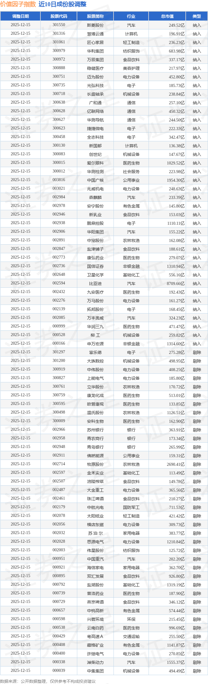 近10日内价值因子(980056)指数成份股做了调整,新纳入了38只股票,剔除了38只股票。