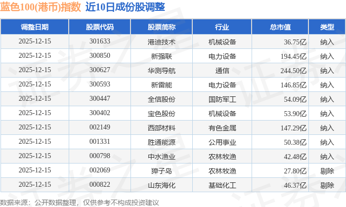 近10日内蓝色100(港币)(980069)指数成份股做了调整,新纳入了9只股票,剔除了2只股票。