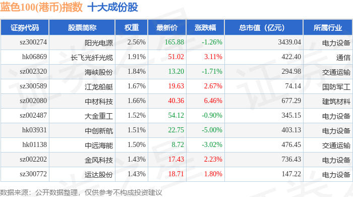蓝色100(港币)(980069)指数十大成份股详情如下: