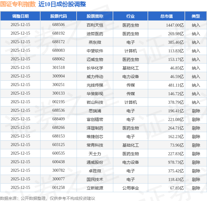 近10日内国证专利(980070)指数成份股做了调整,新纳入了10只股票,剔除了10只股票。