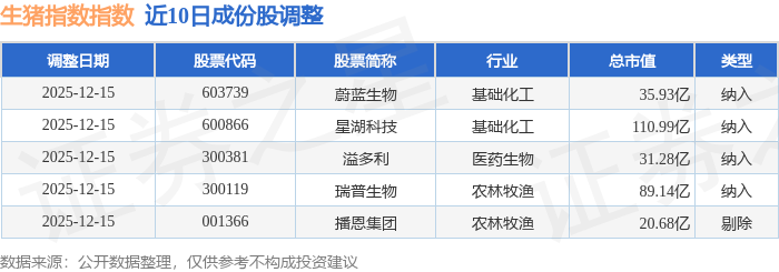 近10日内生猪指数(980073)成份股做了调整,新纳入了4只股票,剔除了1只股票。