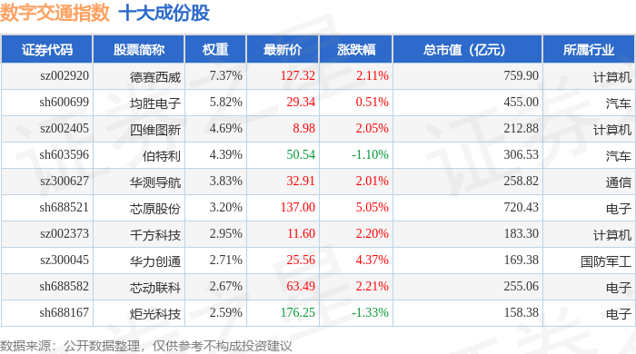 数字交通(980075)指数十大成份股详情如下: